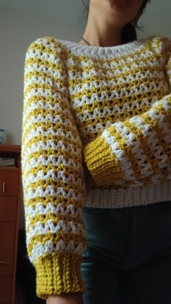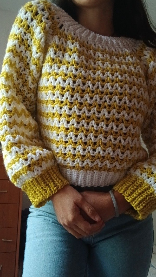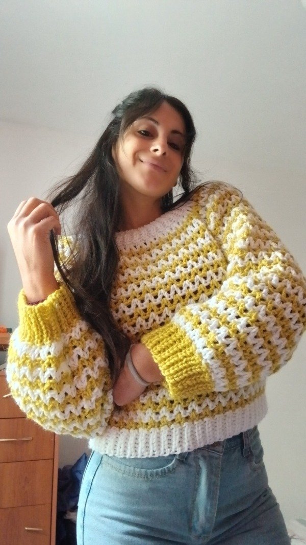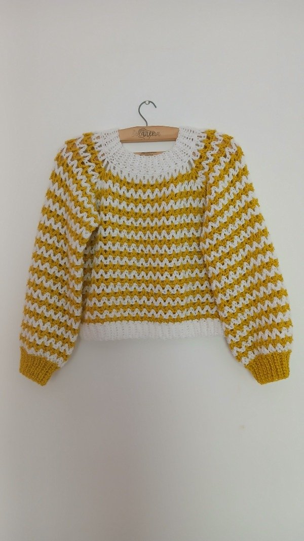 Este sueter no tiene costura, por lo que es más fácil de tejer y a la vez más rápido.